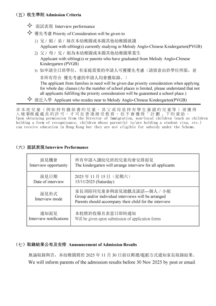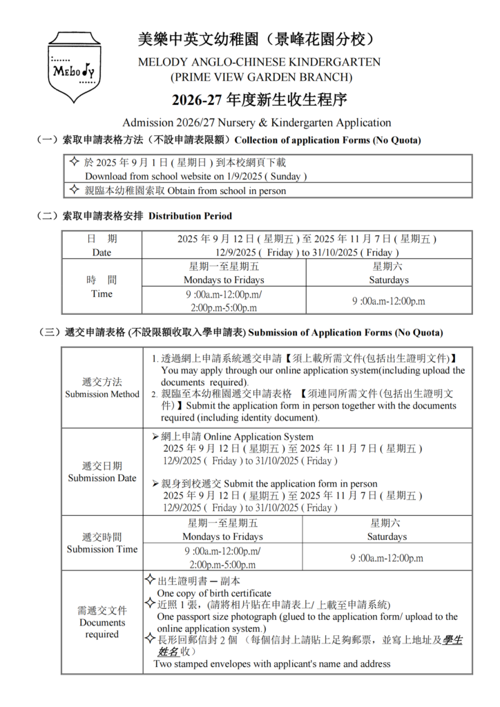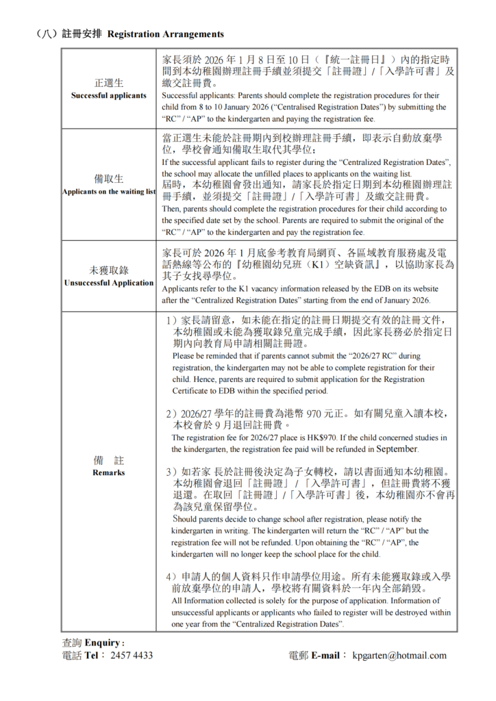 報名須知 Details For Enrollment 教育局「2026/27 K1 收生安排」 教育局「2026/27 K1 收生安排」 https://www.edb.gov.hk/tc/edu-system/preprimary-kindergarten/kindergarten-k1-admission-arrangements/2627_admission_arrangements.html Admission Arrangements for Nursery (K1) Classes in Kindergartens for the 2026/27 School Year https://www.edb.gov.hk/en/edu-system/preprimary-kindergarten/kindergarten-k1-admission-arrangements/2627_admission_arrangements.html 返回